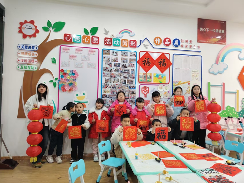 活动流程兼具知识性与趣味性:开场通过趣味动画短片科普福字文化与马年吉祥寓意,让孩子们了解拓印这一古老技艺的传承价值;随后进入DIY实践环节,孩子们在家长与志愿者协助下,自主选择模板完成拓印、晾干、装饰,创作专属马年福字;最后开展“福字送邻里”互动,孩子们将亲手制作的福字赠予社区长辈与同伴,传递新春祝福。