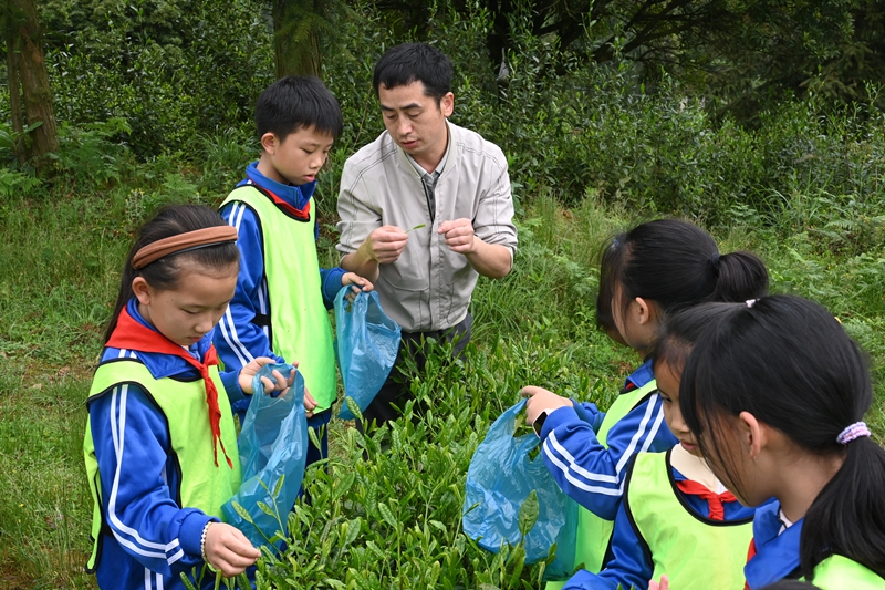 此次活动紧扣谷雨时节采茶传统,将课堂从校园延伸至青山绿水间的茶园,为学生们打造了一场沉浸式的教育体验。在牛丫山茶非物质文化遗产传承人唐汉波的悉心指导下,孩子们化身“小小茶农”,穿梭于翠绿茶树间,学习采摘技巧,体验采茶乐趣。指尖轻捻,一芽一叶,劳动的汗水与收获的喜悦交织,让孩子们在实践中深刻感悟劳动之美,体会劳动创造价值的真谛。