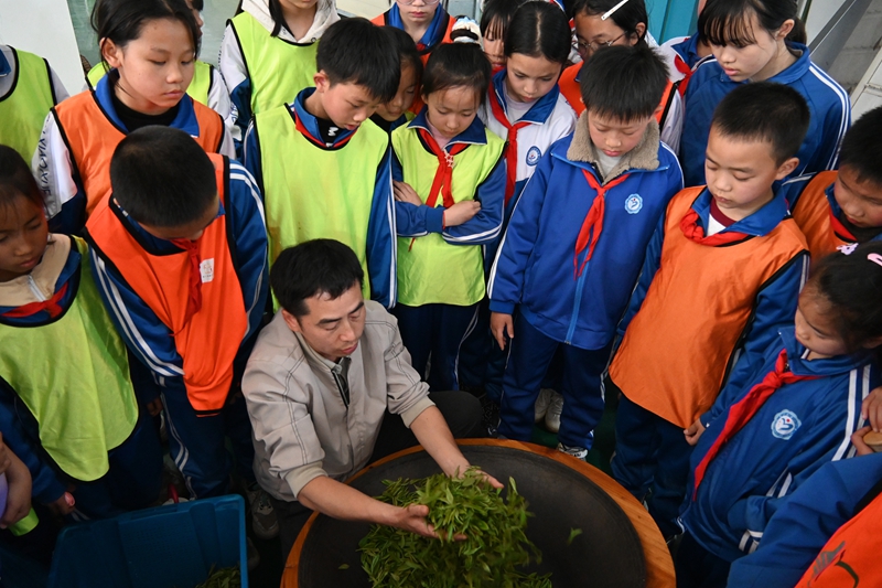 活动最后,孩子们围在炒茶锅旁,观看唐老师现场演示传统炒茶工艺。杀青、揉捻、干燥……一道道工序在老师娴熟的手法下有条不紊地进行,茶香随着翻炒渐渐弥漫开来。孩子们目不转睛,见证着鲜叶到香茗的蜕变,感受着非遗传承人精益求精、坚守匠心的精神。