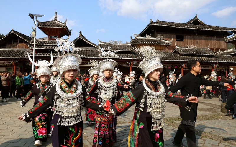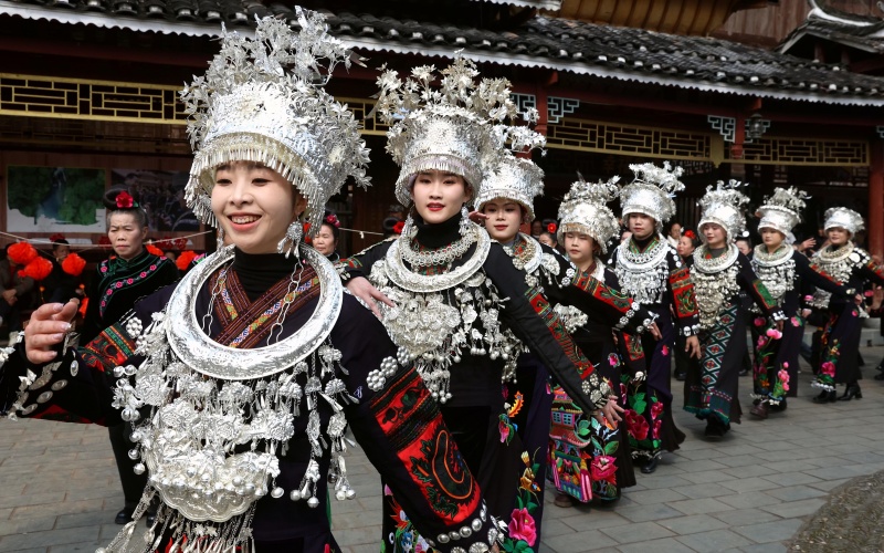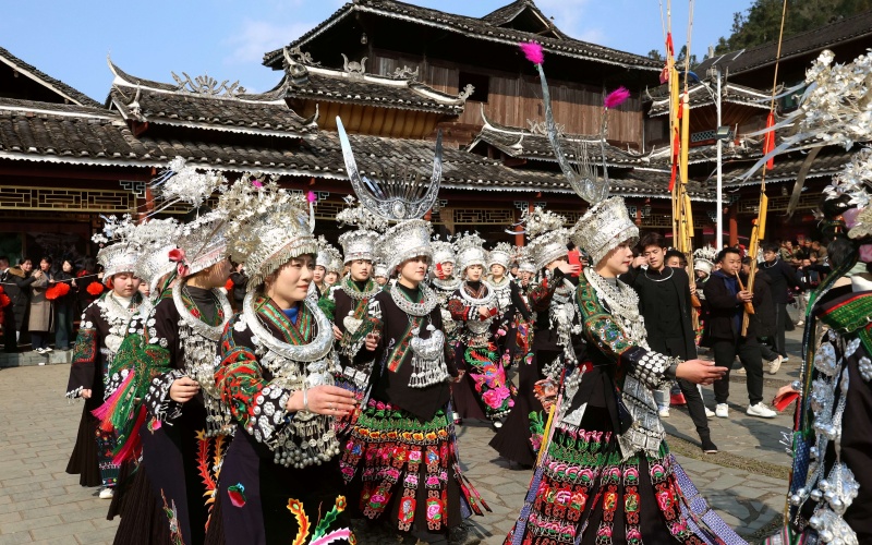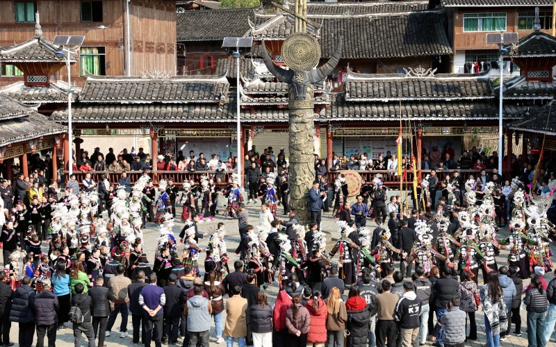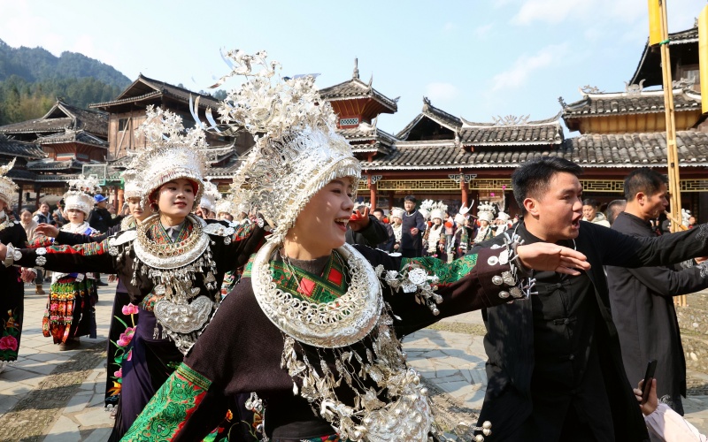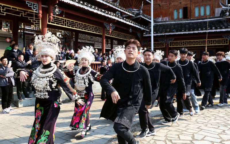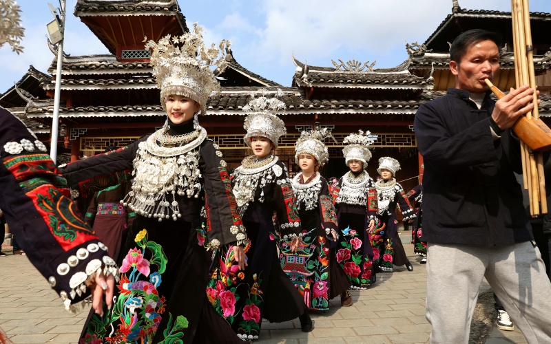 2月19日,在榕江县平阳乡丹江村,苗族同胞在吹芦笙、跳芦笙舞。