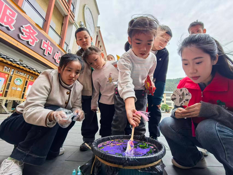 活动的核心亮点是将非遗文化体验融入儿童娱乐。镇团委特别设置了“染漆扇”非遗体验环节。在体验区,孩子们看着五彩颜料和水盆,充满好奇。“老师,这个真的能染到扇子上吗?”一个小朋友仰头问道。