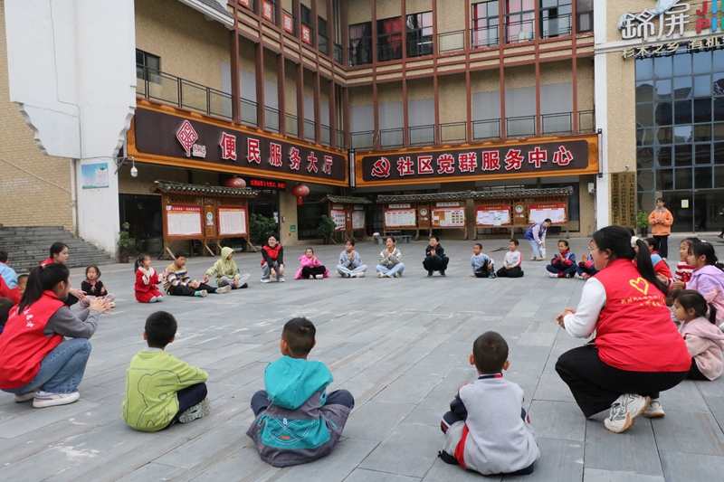 活动一开始,镇团委志愿者与社区老师通过轻松互动迅速与孩子们打成一片。“大家平时最喜欢玩什么游戏呀?”龙老师的一个问题,立刻点燃了现场气氛,“老鹰捉小鸡!”“捉迷藏!”孩子们争相回答。在欢声笑语中,经典集体游戏“丢手绢”率先开场。熟悉的童谣响起,孩子们围坐一圈,紧张又期待地回头张望。当手绢被悄悄放在一位小女孩身后,志愿者鼓励道:“快,发现啦!追上他!”一场欢乐的追逐随即展开,加油声与欢笑声汇成一片。随后进行的“黏手链”游戏将气氛推向高潮。志愿者向手拉手的“人链”发出挑战:“我们这条‘大链子’要来抓人咯,大家快跑!”分散的孩子们一边尖叫一边笑着躲闪。孩子们与志愿者在协同“作战”中,增强了团队协作意识和集体归属感。这些趣味游戏,成为连接志愿者与孩子们、孩子与孩子之间最坚实的情感纽带。