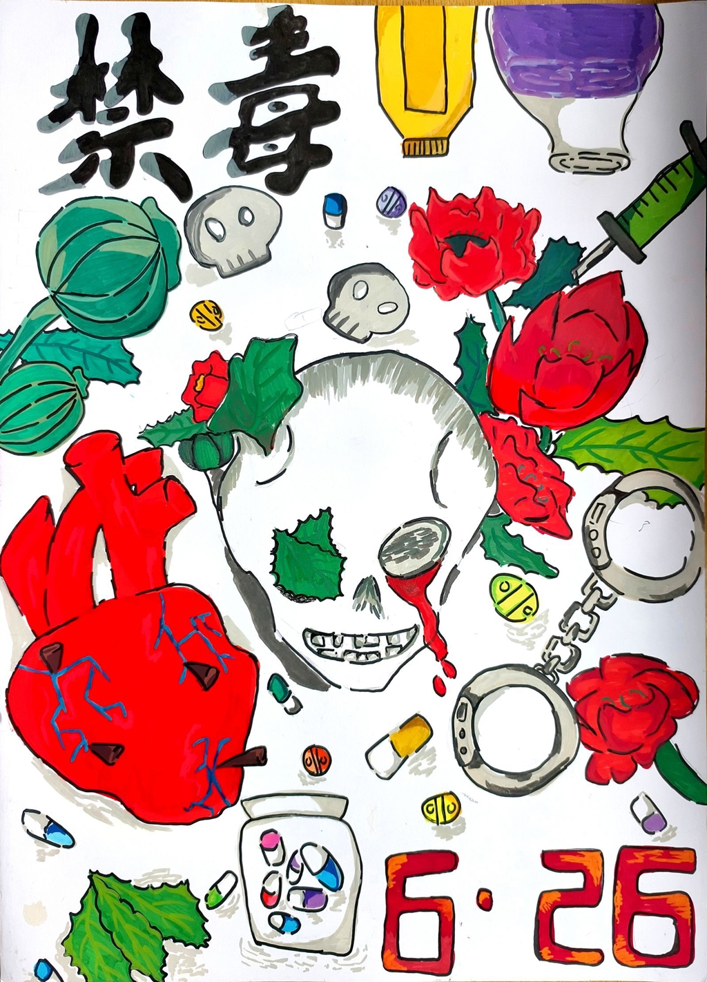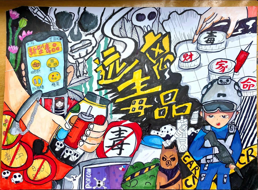 比赛筹备阶段,学校通过主题班会普及禁毒知识,引导学生了解毒品对个人健康、家庭幸福和社会稳定的严重危害,为创作积累素材。活动现场,同学们化身“禁毒小卫士”,以水彩、漫画、蜡笔等多种形式挥毫创作。有的用强烈的色彩对比,勾勒毒品如“恶魔”般吞噬生命的狰狞面目;有的以温馨场景描绘远离毒品后的阳光生活,传递对美好未来的向往;还有的通过幽默诙谐的漫画情节,直观揭露毒品陷阱,警示同龄人珍爱生命。每一幅作品都主题鲜明、创意十足,既饱含童真童趣,又彰显着少年儿童对禁毒的坚定立场。