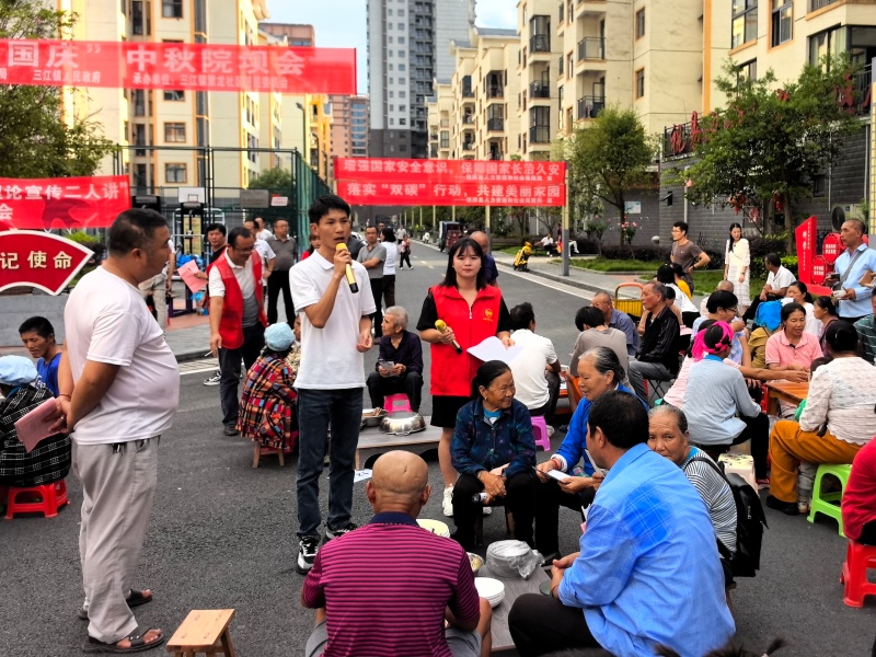 9月28日下午,锦屏县三江镇聚龙社区开展“感党恩·庆国庆”中秋院坝会活动。通过宣传乡村振兴政策、防诈骗、就业、工伤等内容,并与群众同吃“连心饭”的方式来增强社区居民的认同感、幸福感和满意度。