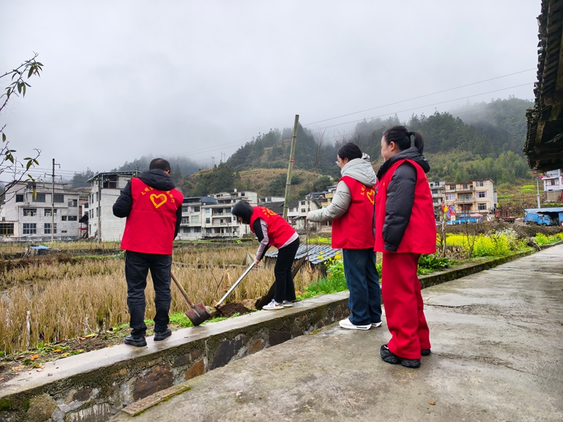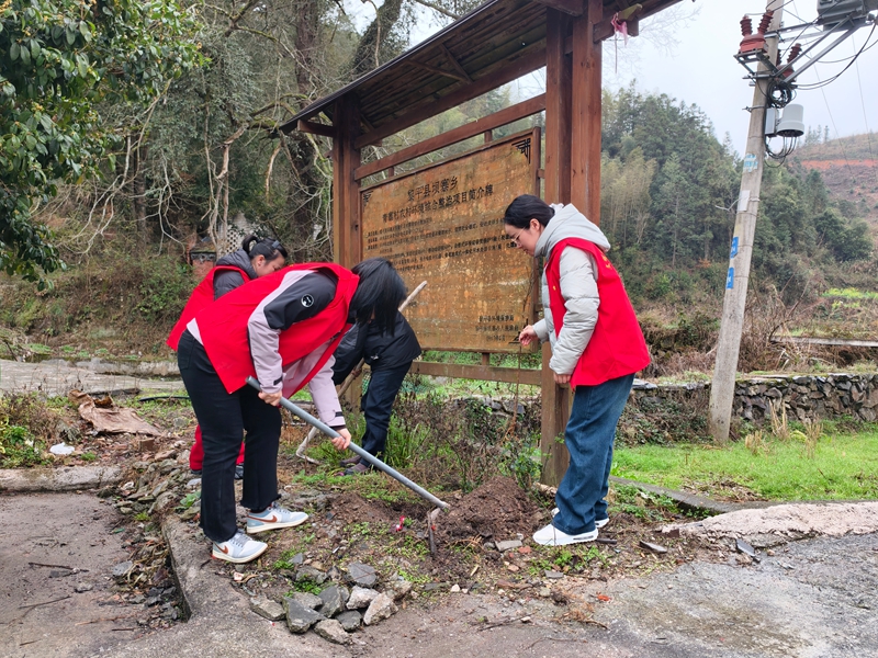 本次活动紧扣“两清两改两治理”核心任务,科学规划“植绿+整治”双重点区域,选址于“红军路”沿线及青寨村残垣断壁整治区,既聚焦生态薄弱点,又瞄准环境整治痛点。活动前期,志愿者队伍先行开展“清垃圾、清杂物”行动,集中清理沿线枯枝败叶、生活垃圾及废弃杂物,为植树造林扫清环境障碍。植树环节科学选用樱花、紫薇等兼具生态防护、景观观赏与水土保持功能的乡土树种,共计栽种苗木450余株,绿化面积达10余亩。植树现场,大家分工协作、默契配合,挥锹铲土、扶苗固根、踩实培土,党员干部带头冲锋在前,青年志愿者同步开展生态宣传,既呈现出“干群同心植新绿”的火热场景,更形成“人人参与治环境”的良好氛围。