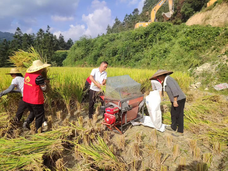 “群众的事,再小也是大事。必须把保障农民丰收作为当前最重要的任务,做到哪里有需要,干部就战斗在哪里,坚决不让一户农户因困难误了农时。”在助农现场,志愿者服务队队长一边熟练地操控着脱粒机一边说道。一把把稻穗稳稳送入机器时,伴随着机器的轰鸣声,饱满的谷粒欢快地跳跃而出,一旁农户们也赶忙帮忙将脱粒好的稻谷装袋,脸上满是对丰收的期待。收割完的稻谷需要搬运归仓,党员干部们和农户们肩扛手抬,一趟趟穿梭在稻田与农户家之间,尽管汗水早已湿透衣衫,却没人喊一声累。
