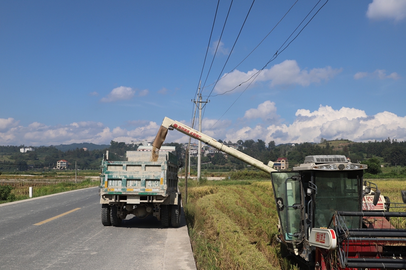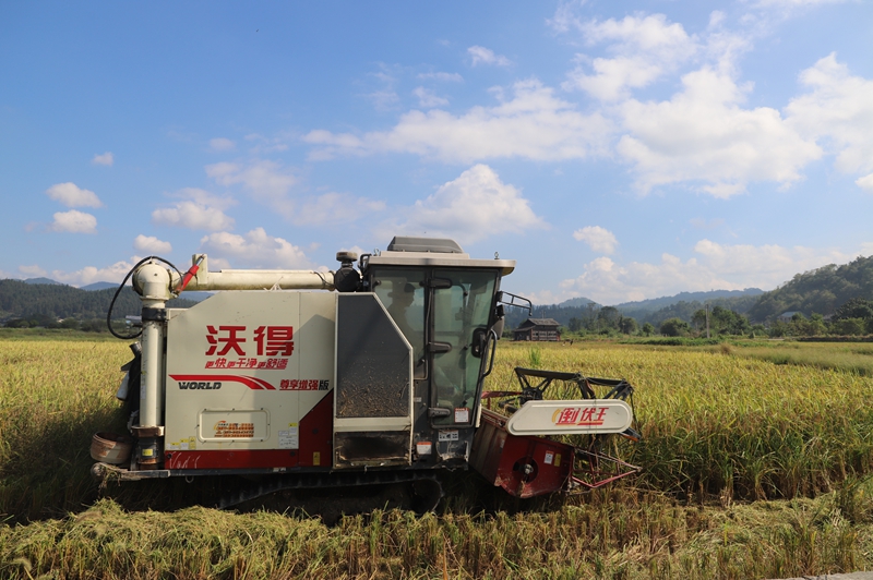 金秋时节,铜鼓镇的田野间一派热火朝天的丰收图景。收割机的轰鸣声此起彼伏与微风拂过稻穗的沙沙声交织,奏响了秋日里最动听的“丰收乐章”。
