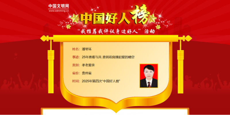 潘琴环,女,1974年4月生,中共党员,贵州省黔东南州天柱县凤城街道南门社区党委书记、居民委员会主任。2000年,潘琴环的丈夫意外去世,留下体弱多病的公婆和两岁的儿子。2015年,公公突发脑出血住院,她与婆婆轮流照料,喂饭、按摩,无微不至。2022年,婆婆重病,她连夜筹钱救治,婆婆瘫痪后,她一边忙于社区工作,一边坚持带婆婆做康复,变着花样准备餐食。潘琴环曾获全国模范人民调解员、贵州省“最美劳动者”、贵州省“三八红旗手”、贵州省道德模范提名奖、“贵州好人”等荣誉。