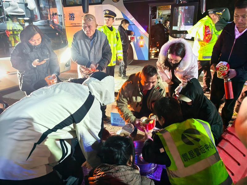 2026年1月20日晚,强冷空气来袭,黎平县遭遇大范围寒潮低温雪凝天气,辖区高速实施临时交通管制,两辆从深圳发往凯里的长途客车滞留在黎平县中潮镇长春高速路口,96名旅客归家路被阻。