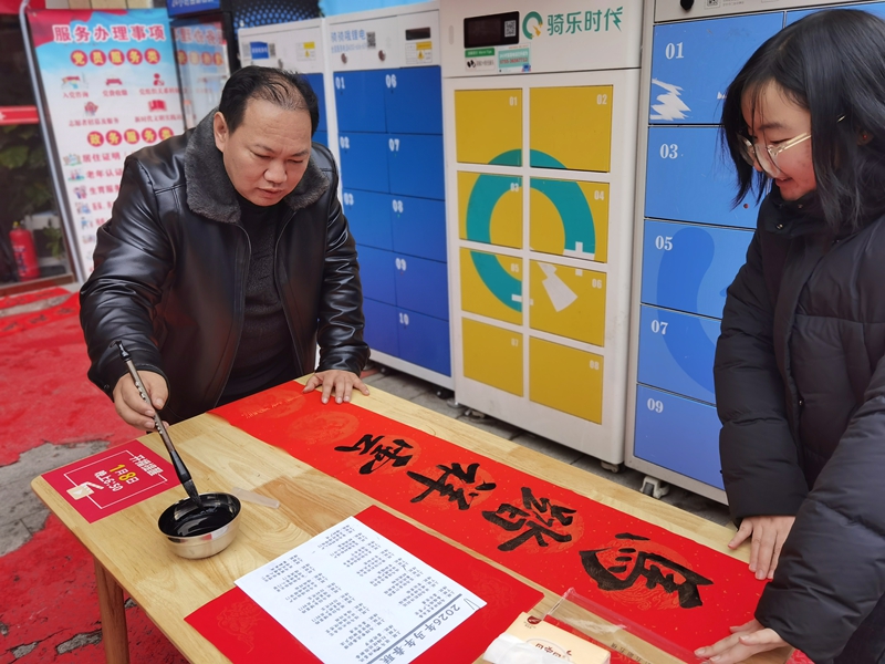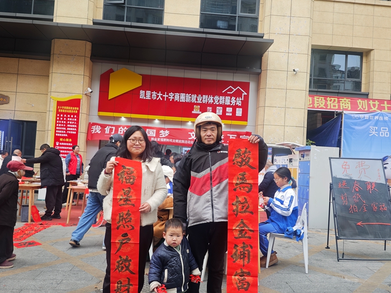 为深入贯彻习近平文化思想,扎实开展“我们的中国梦・文化进万家”系列活动,营造喜庆祥和、温馨浓郁的新春氛围。近日,由凯里市委宣传部牵头,大十字街道联合市文学艺术界联合会共同承办的送春联、剪纸、拍全家福新时代文明实践活动,在凯里市大十字商圈新就业群体党群服务站温情开展。活动以文化为纽带,将新春祝福与人文关怀送到新就业群体及周边群众心坎上,让基层群众在翰墨书香与非遗魅力中感受传统文化底蕴,喜迎新春佳节。
