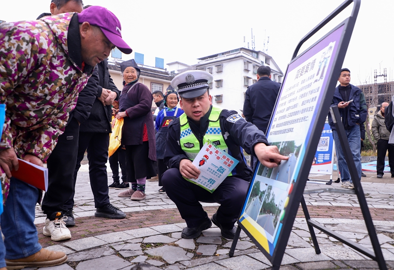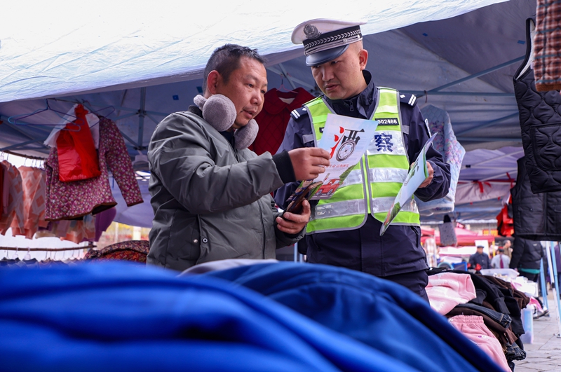 12月3日,丹寨县公安局交警大队利用农村赶集日,组织宣传民辅警在辖区扬武镇金扬广场开展道路交通安全宣传活动,通过宣传讲解,共同营造文明参与交通、安全文明出行的良好社会氛围。(陆德华 摄)