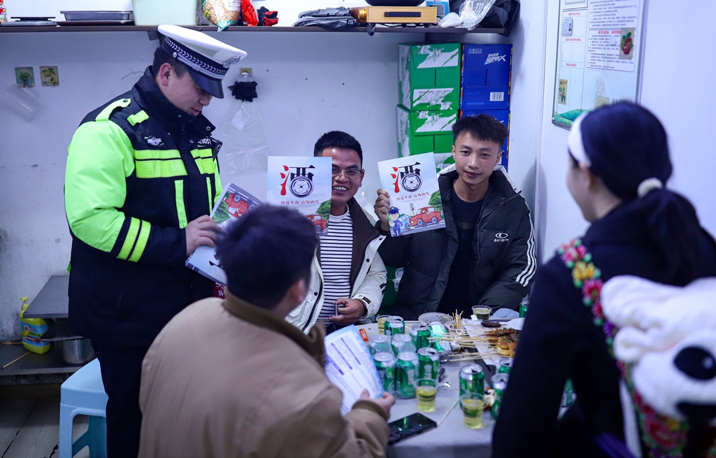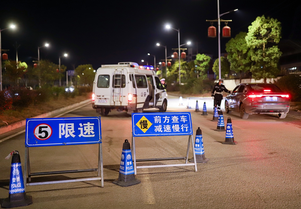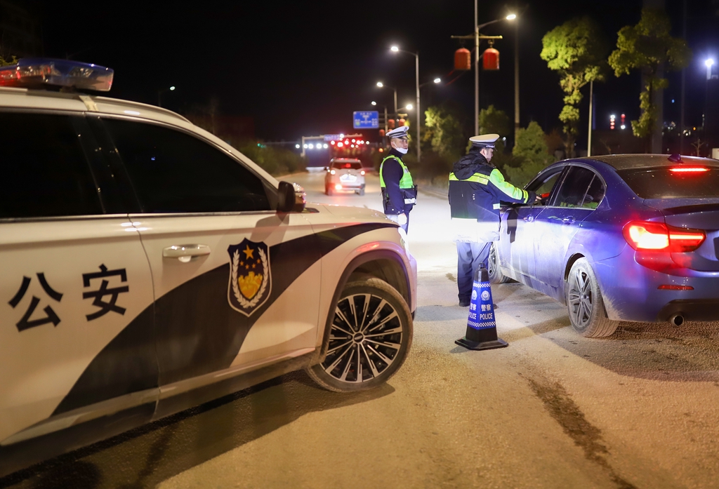 春节将至,2月10日晚,丹寨县交通管理大队组织警力在辖区持续开展交通违法集中整治行动,通过查处+宣传的方式,在严厉打击各类交通违法行为,及时消除交通安全隐患的同时,进一步筑牢辖区节前道路交通安全防线,确保广大群众出行安全。(陆德华 摄)