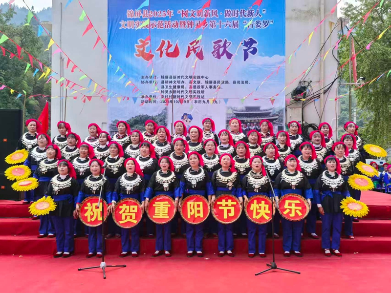 情暖重阳日,文明绘新风。10月29日,晨雾裹着苗寨炊烟漫过娄江,家家户户门前插满茱萸,重阳糕的甜香飘满街巷,锦屏县钟灵乡贡村苗寨鼓声雷动——35支民歌队齐聚第十六届“古娄罗”文化民歌节,以“古娄罗文脉传,文明实践兴苗乡”为主题,让民族文化与重阳敬老新风碰撞出别样火花。