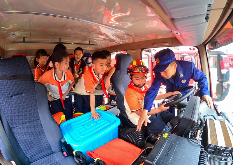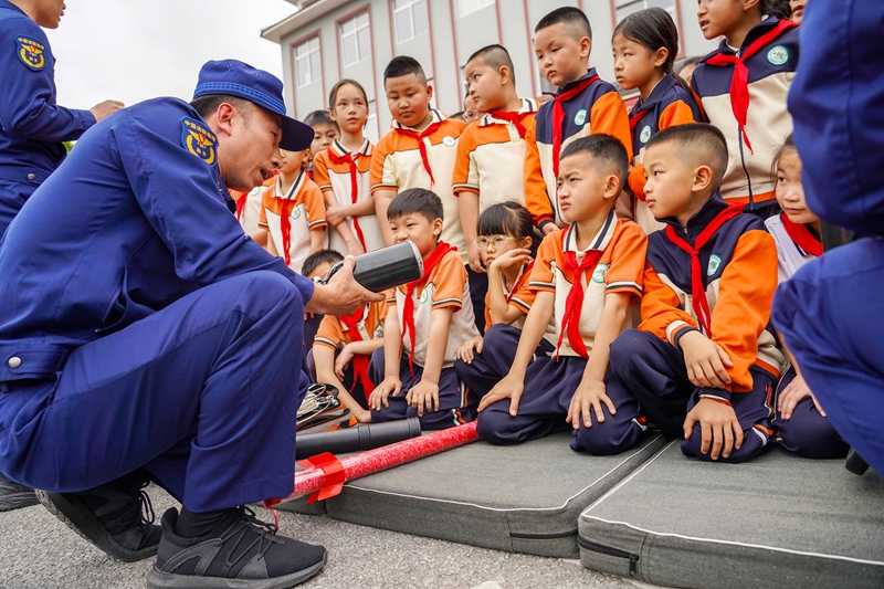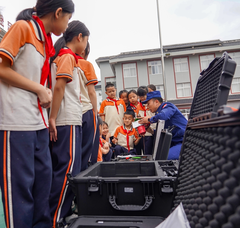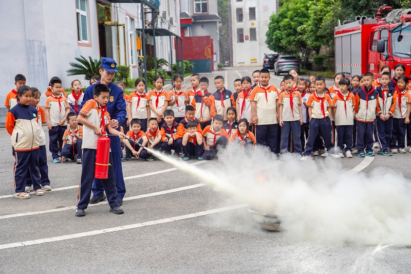在从江县消防救援大队营区内,消防救援人员为学生们详细讲解了消防破拆工具、灭火器及其他消防器材的使用方法和适用场景。学生们认真聆听,不时提问互动。在实操环节,消防员手把手指导学生正确使用灭火器进行油盆灭火演练,还让学生们近距离观摩破拆工具的操作过程。通过现场讲解、实物展示与亲身实践相结合的方式,孩子们不仅增强了消防安全意识,也提升了应急自救互救能力。