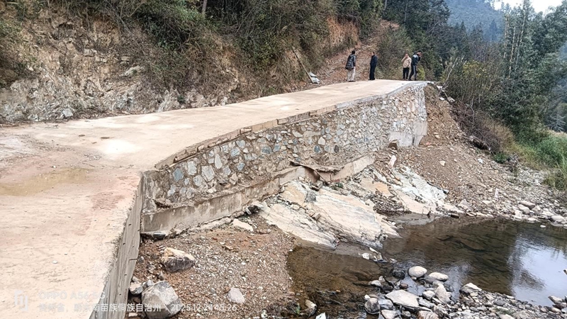 2025年6月中下旬,水口镇遭遇持续强降雨天气,河口村作为临河村寨,连续暴雨让道路等基础设施受到不同程度损坏,其中滚干漫水桥(全长15米)、美埂机耕道(全长80米)等核心基础设施严重损毁,出现路面坍塌、路基冲毁等险情,形成重大安全隐患;更有新言寨消防排水沟(全长50米)亦因灾损毁堵塞,严重影响群众正常生产生活与出行安全。