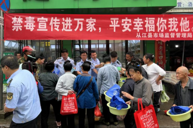 为进一步增强全民禁毒意识,筑牢农村禁毒安全防线,近日,从江县市场监督管理局联合当地派出所,在贯洞镇组织开展了以“禁毒宣传进万家、平安幸福你我他”为主题的禁毒宣传教育活动。