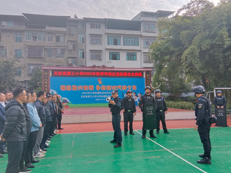 为进一步提升校园安全防范能力,增强师生应对突发暴力事件的应急处置能力,10月29日上午,天柱县公安局特巡警大队与天柱县第三小学联合开展了一场逼真生动的防暴演练活动。此次活动通过模拟实战场景、专业培训指导,为全校师生上了一堂生动的安全教育课。
