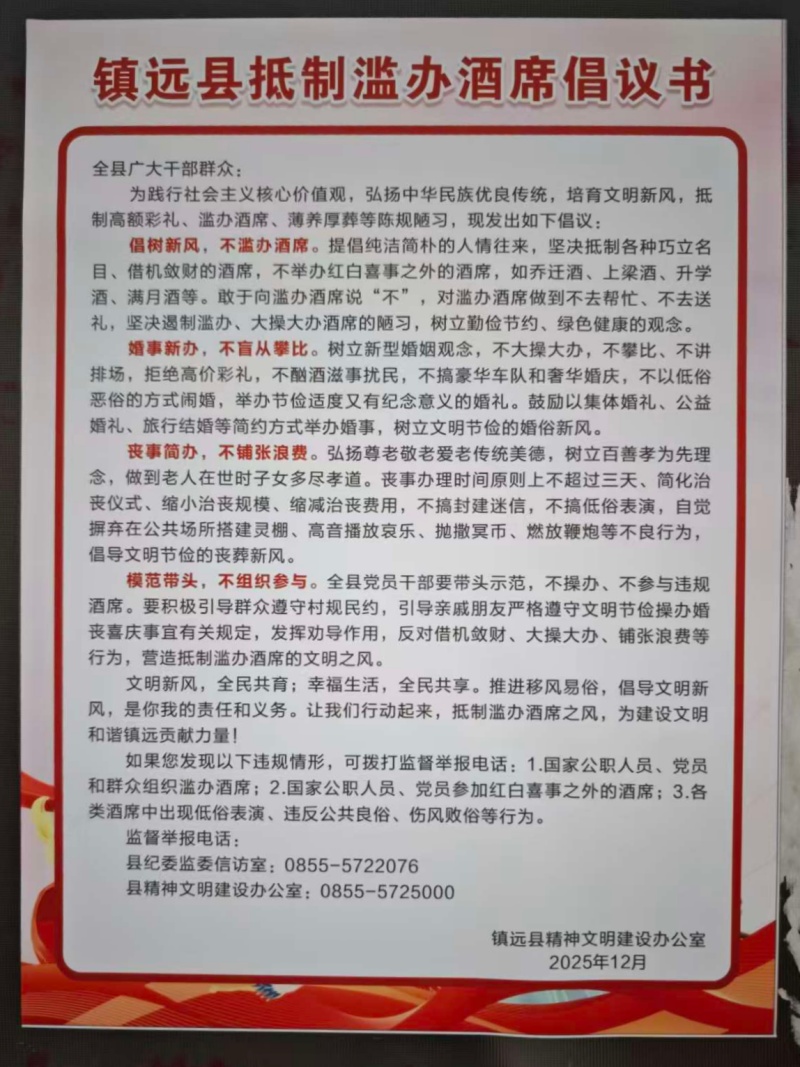 各村(社区)召开专题部署会,压实工作责任。村“两委”及驻村工作队紧密结合爱心妈妈(爸爸)结对帮扶、合医征缴等日常工作,围绕“喜事新办、丧事简办,余事不办”等文明理念,开展多形式、接地气的政策宣讲。统一制作并广泛张贴移风易俗倡议书。截至目前,全乡累计张贴公示材料128份,有效拓宽社会监督渠道,激发群众参与监督、自觉践行新风的内生动力。