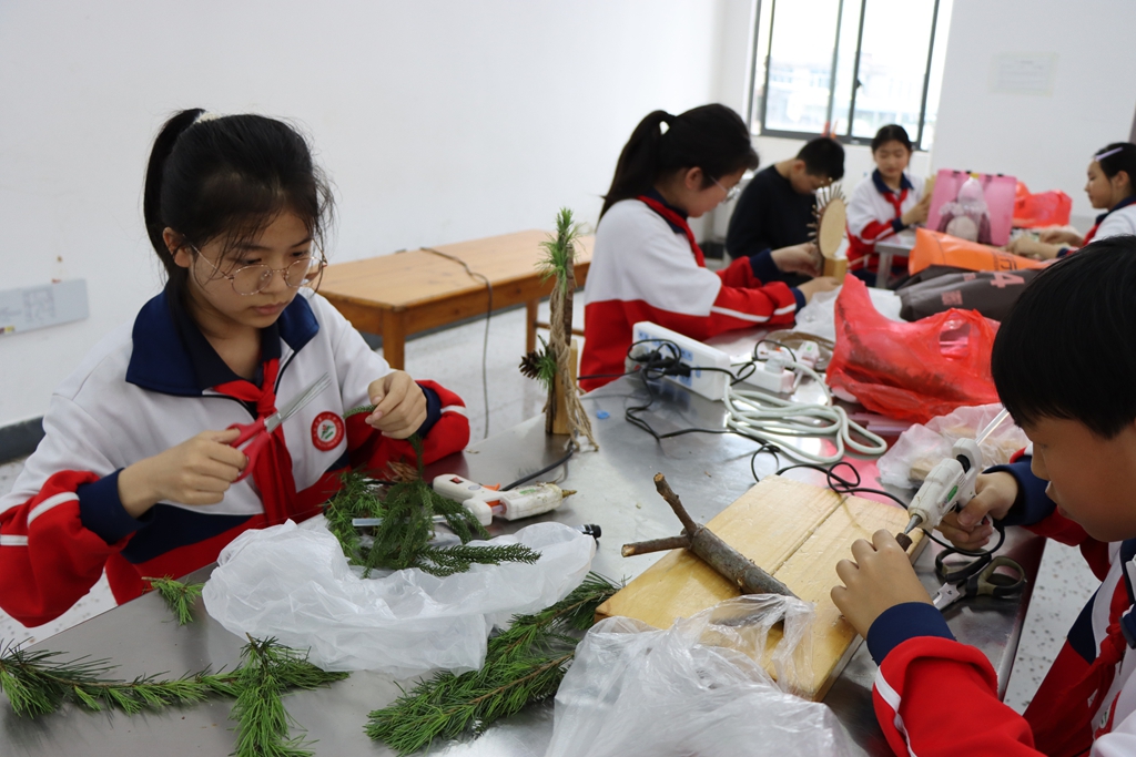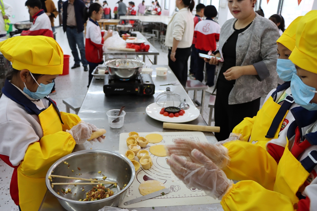 赛场上,各年级项目精彩纷呈。低年级选手化身“创意小厨师”,清洗蔬果、精心搭配,雕琢出造型别致的蔬果拼盘;中年级赛场暖意融融,三年级学子擀皮、包制、煮饺子一气呵成,四年级同学穿针引线,巧手编织出毛线饰品;高年级亮点十足,五年级学子翻炒烹煮家乡美食,六年级选手精雕细琢木工雕刻作品。选手们分工协作、全神贯注,现场氛围热烈而温馨。