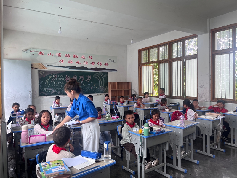 教室里,孩子们端正地坐着,眼睛里闪烁着好奇与期待。爱心团队走进教室,将文具盒和书包一一发给大家,并细心帮孩子调整书包背带长度,嘱咐大家好好学习。