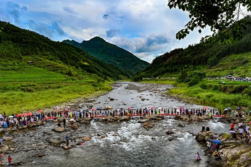 活化民俗文化,引爆文旅融合。农历六月十四“跳水节”是刚边村特色民俗,村里恢复“跳水选亲”传统习俗,打造祭祀、竹排漂流、壮歌对唱等原生态活动,将传统节日打造成文旅名片。以节聚人气、以旅促增收,带动农特产品畅销,推动农文旅深度融合,促进民族团结与乡村发展同频共振。