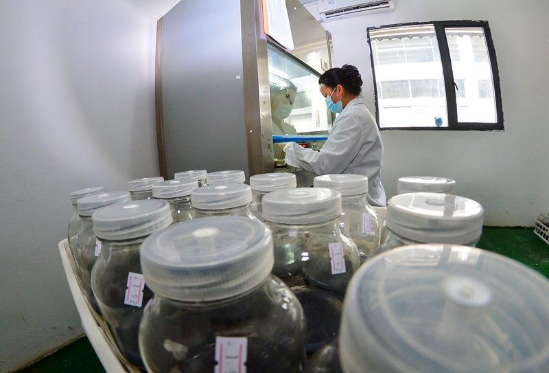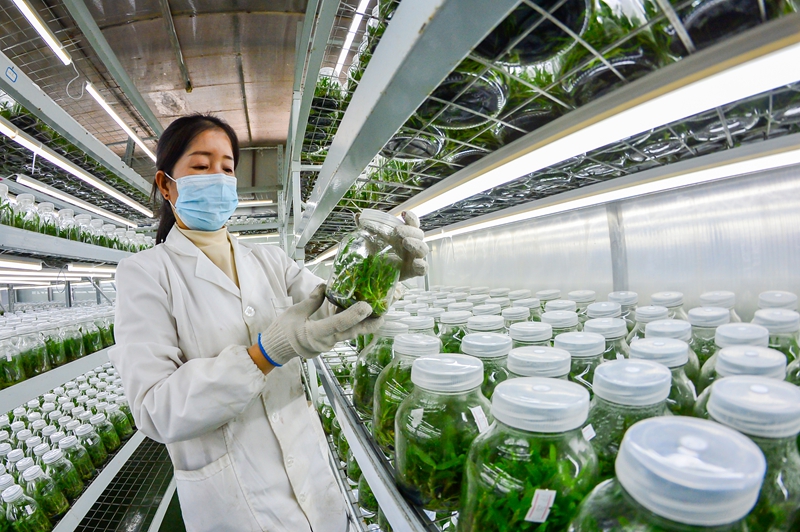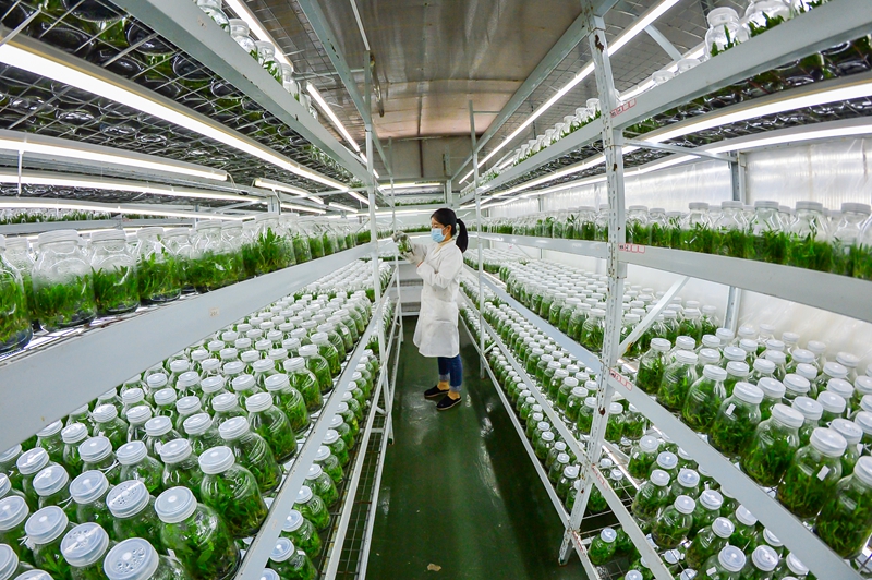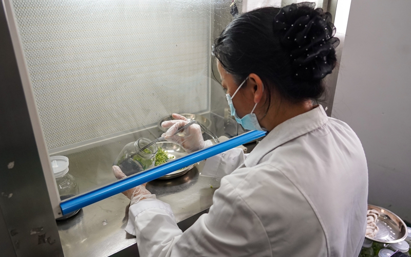 2026年1月9日,工人在从江县贯洞镇铁皮石斛育苗基地的组培室里管护铁皮石斛苗。