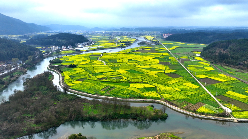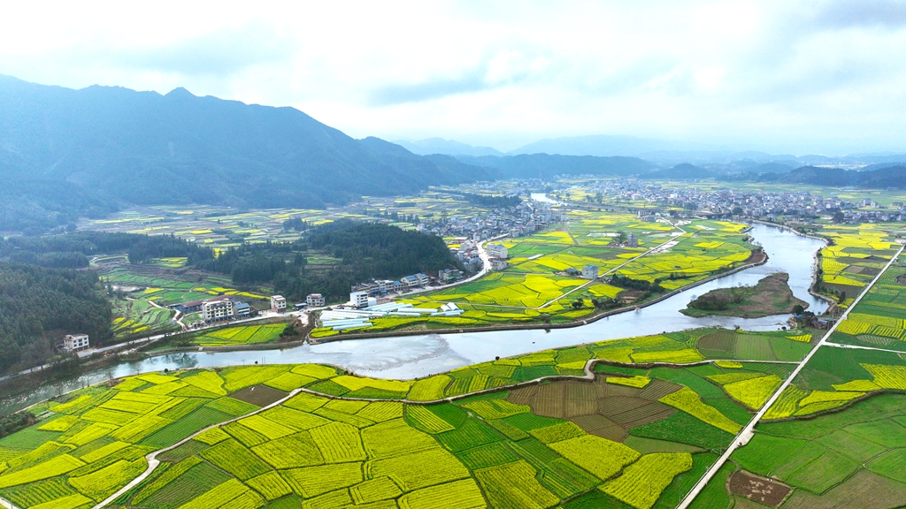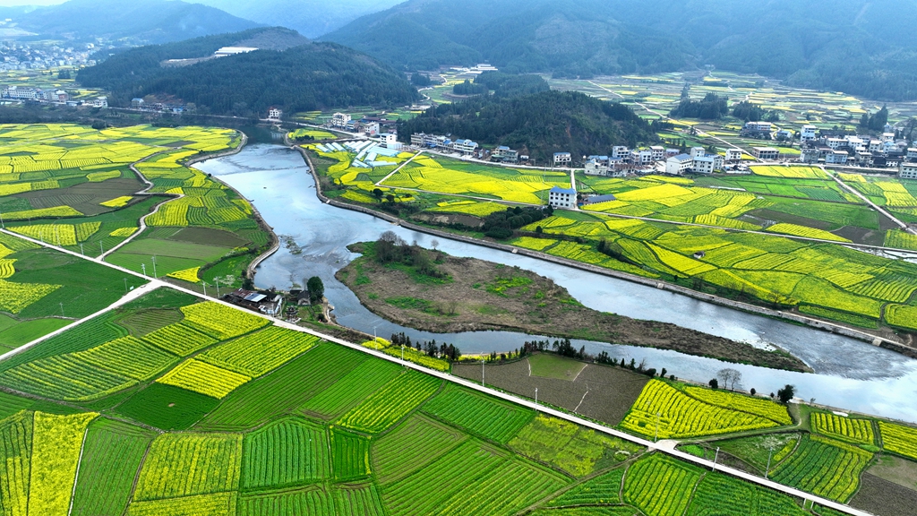 3月4日,春风送暖,锦屏县敦寨镇亮江流域十里画廊生机勃发。航拍镜头下,蜿蜒江水如碧带环绕,金黄油菜花与翠绿秧田交织成锦,田埂阡陌勾勒出大地肌理,错落民居点缀其间,远山含黛,一派盎然春意。