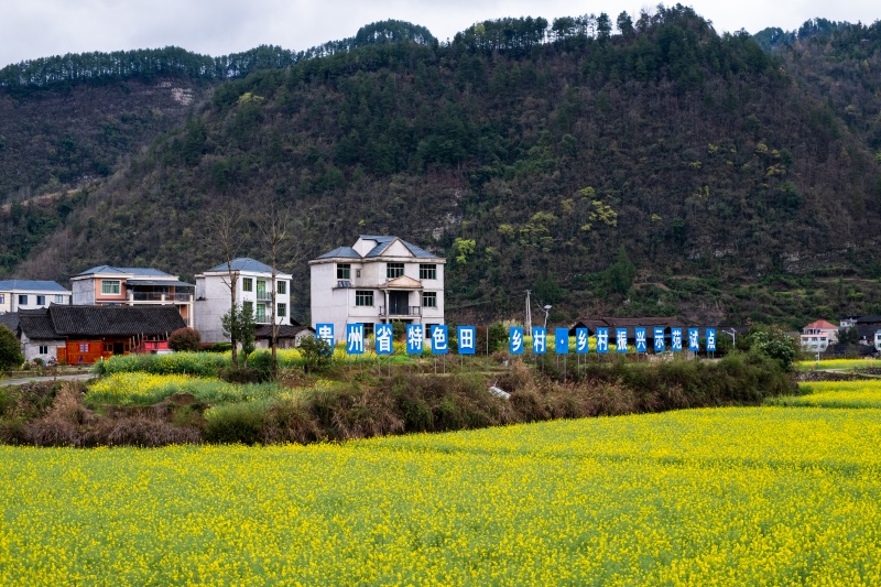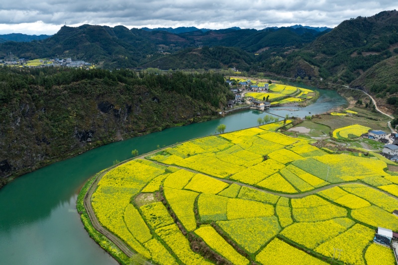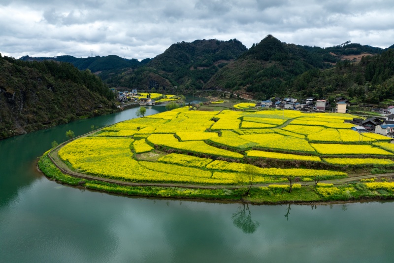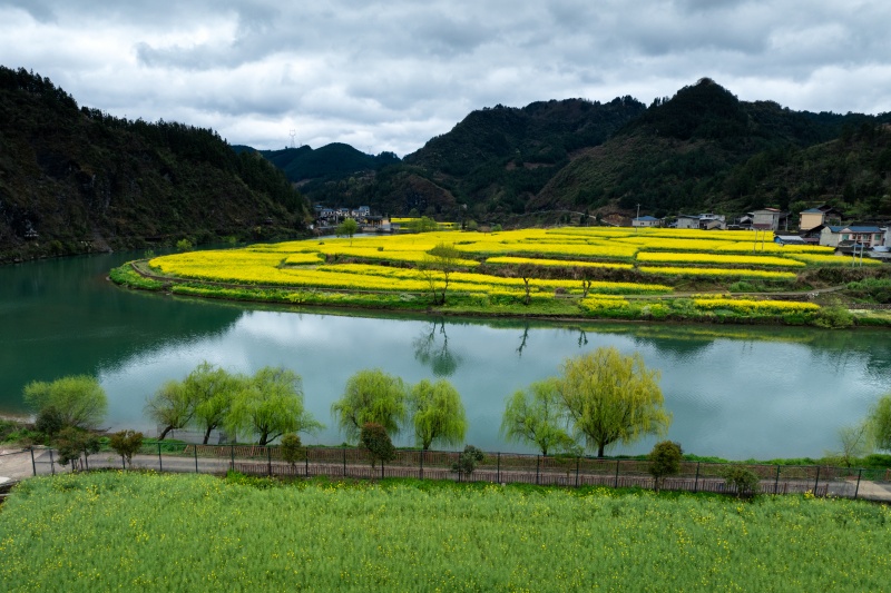 春日时节,岑巩县注溪镇周坪村、思旸镇磨寨村的龙江河畔,春风拂面,美景如画。连片的油菜花田如金色绸缎沿河岸铺展,与清澈的龙江碧水、错落的村寨民居、青翠的连绵山峦相映成趣,勾勒出春日乡村的灵动诗意。
