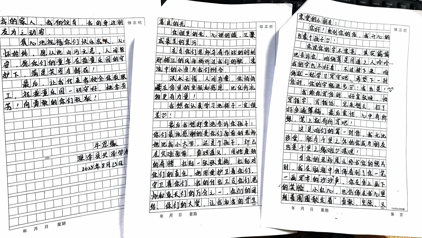 感谢信寄出后,很快收到了这位河南教师的回信。信中写道:“收到孩子们的信,我热泪盈眶,这是我收到的最珍贵的礼物。洪水无情,人间有爱,看到你们重返乐园,我由衷地为你们高兴。”她在信中鼓励孩子们:“困难只是暂时的,希望你们心怀希望、努力学习,未来定会绽放光芒。更希望你们永葆善良与勇敢之心,将这份爱心接力传递下去。”