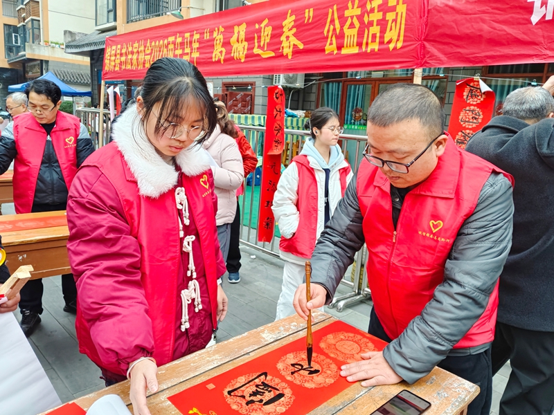 活动现场,红色主题横幅醒目高悬,铺满地面的春联与悬挂的“福”字交相辉映,勾勒出红火的新春图景。来自县书法家协会的老中青少四代创作者齐聚一堂,在长桌前凝神挥毫。老艺术家运笔沉稳,笔下“福”字苍劲有力;中年书法家风格各异,楷书端庄、行书飘逸、隶书厚重,“九天日暖张鹏翼,四野春新运马蹄”等马年专属春联跃然纸上;青少年书法爱好者也踊跃参与,稚嫩却工整的字迹赢得居民阵阵称赞。