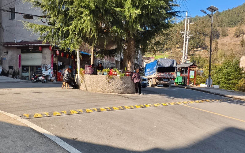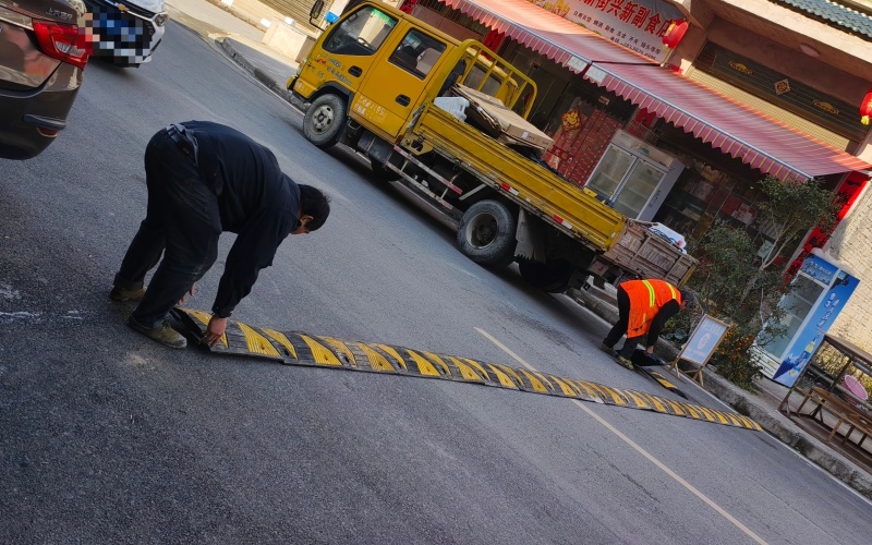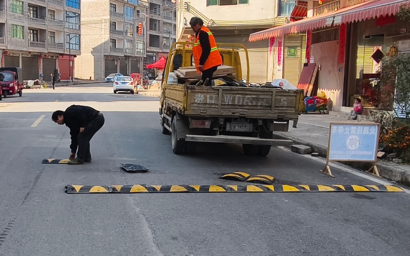 此次安装覆盖金凯村农贸市场出入口、小学校门口等交通节点。施工人员携带专业工具,严格遵循规范流程作业,通过精准测量、定点打孔、牢固铆钉等工序,确保减速带安装质量。经过一天紧张施工,共在重点路段安装减速带4条,每条长10米,形成覆盖主要通行区域的“安全缓冲带”,有效填补了重点区域交通防护空白。
