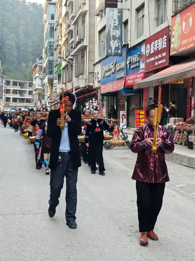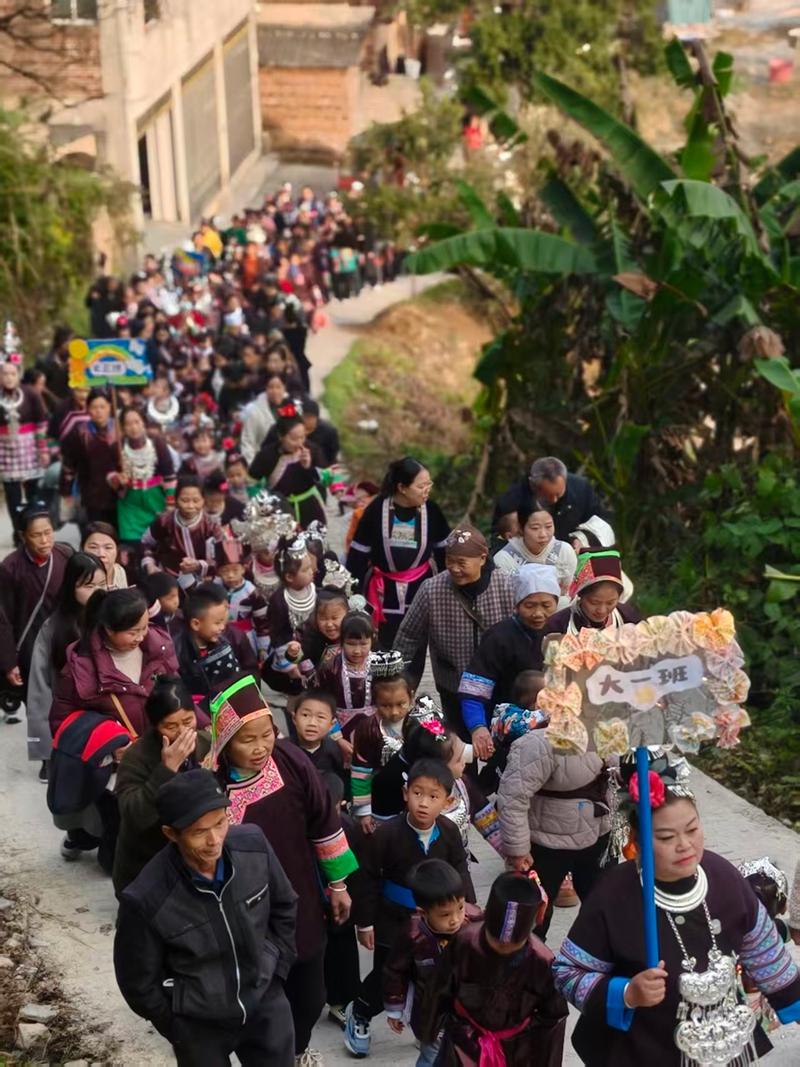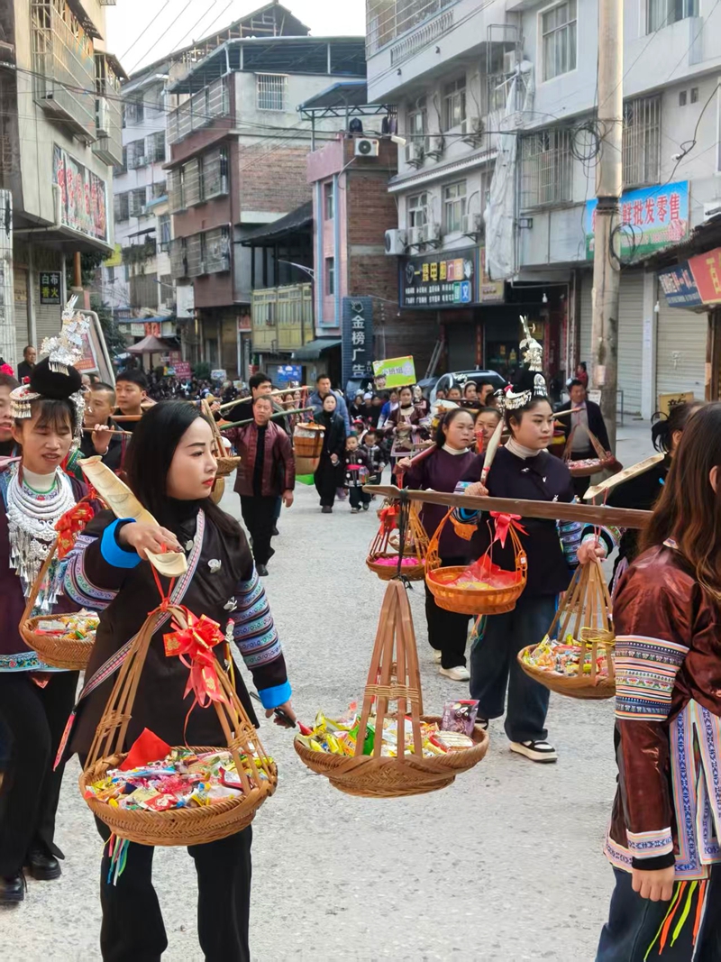 活动当天,一场充满侗族风情的游行率先点燃了节日氛围。家长们肩挑装满水口特色零食的箩筐,带领身着盛装的孩子们,从新市场一路巡游至老街,浩浩荡荡的队伍穿梭在街巷间,成为街头一道靓丽的风景线。