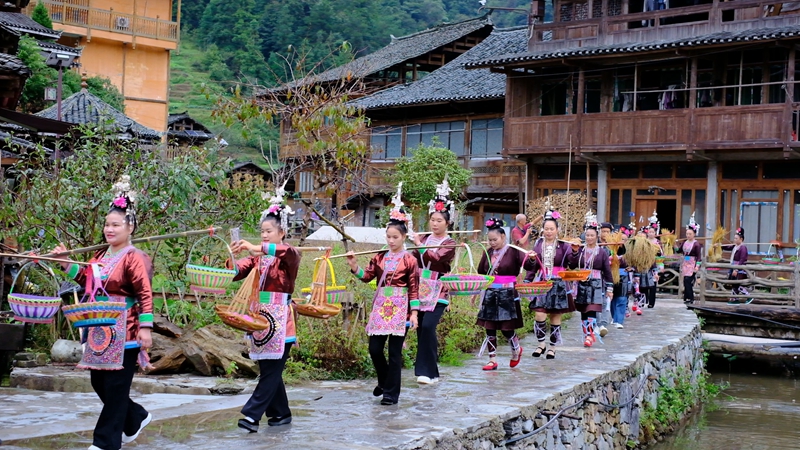 这场节庆的前身是侗族秋收“吃新节”,如今演变为每年10月中旬的香禾糯节。巡游时,村民挑着挂满香禾糯的担子穿梭村寨,田埂上人潮涌动;夜幕降临,欢笑声虽渐歇,村民守护生态农耕、发展特色农业的信念却愈发坚定。从传统祭祀到文化盛宴,从生态种植到乡村振兴,黄岗村正以香禾糯节为纽带,让农耕文明在传承中焕发新的生命力。(姚进忠 石庆桃)
