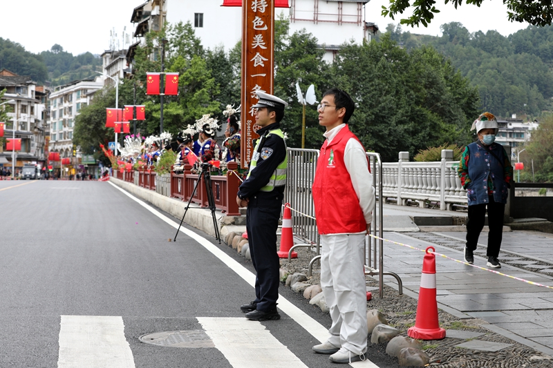 赛事期间,民辅警不仅是安全守护者,更是暖心服务者。面对观赛群众较多的情况,民辅警及时引导村民在安全区域为选手呐喊助威,提醒带孩子的家长注意防护;当发现有选手出现体力不支等情况时,立即通过对讲机呼叫周边医疗组开展紧急处置,用高效协作赢得选手点赞。赛道旁,身着藏青蓝的民辅警与身着银饰苗装的村民相映成趣,一边是严谨值守的安全防线,一边是热情助威的乡土温情,共同构成赛事中一道兼具安全感与烟火气的独特风景线。