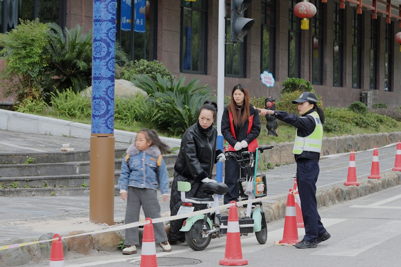 “师傅,前方赛事正在进行,请您从侧边道路绕行,感谢配合!”在各交通管控点,采取远端提前引导车辆绕行分流,近段精准实施交通管制。期间,民辅警耐心引导车辆行人,规范设置隔离护栏与提示标识,用细致的疏导确保赛道“绝对安全、绝对畅通”,为选手创造良好竞技环境。