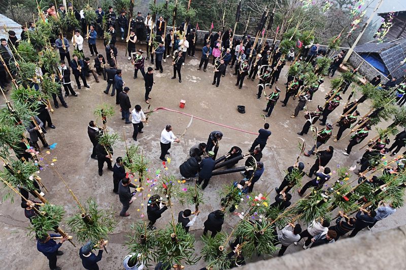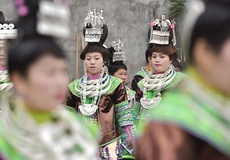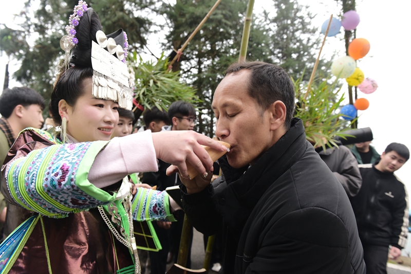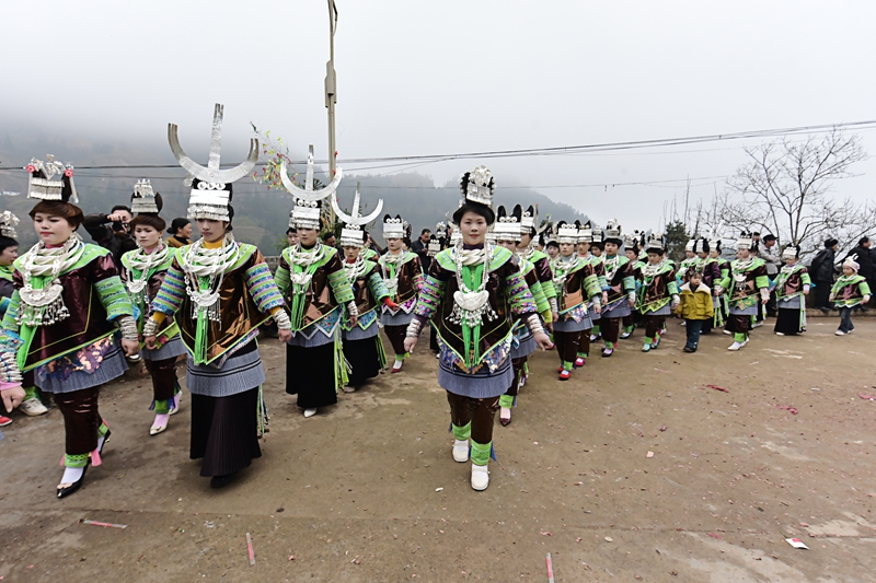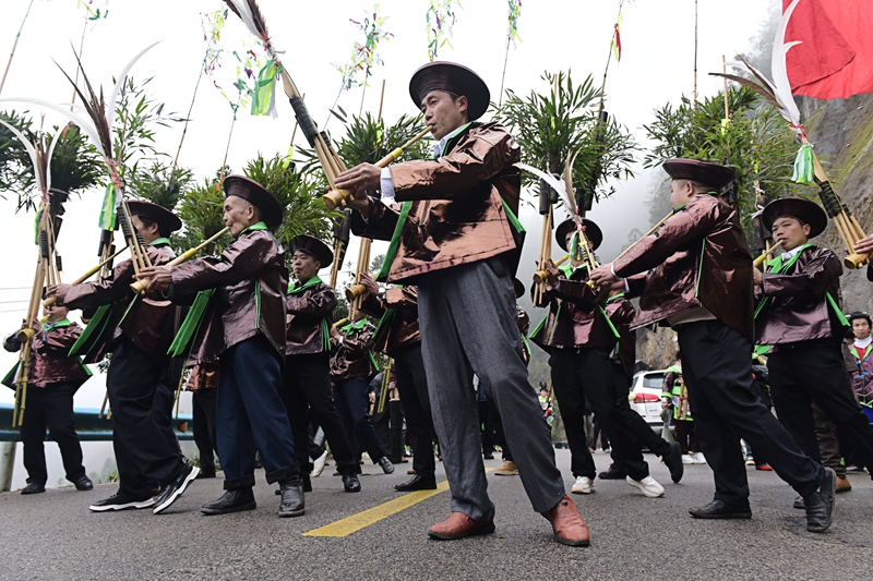2月5日,从江县加勉乡党港村和别鸠村举行芦笙舞迎新春活动。月亮山苗族同胞身着节日盛装,吹奏芦笙,跳芦笙舞,以原汁原味的民俗活动喜迎新春佳节,吸引众多游客前来体验。(龙梦前 摄)