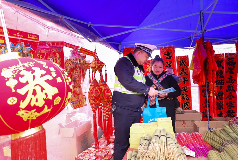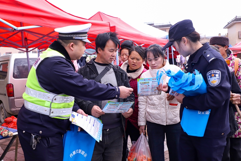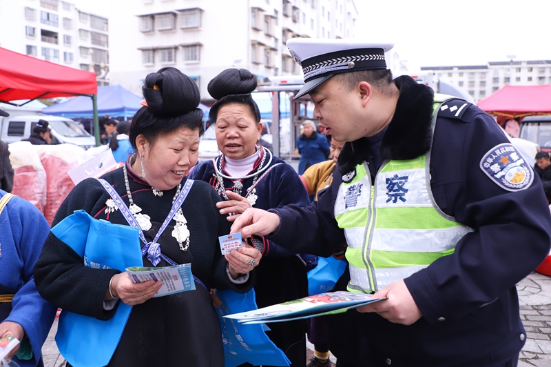 春节临近,农村年货集市车水马龙,热闹非凡,2月11日,丹寨县公安局交通管理大队巧借农村“赶集日”,联合辖区扬武派出所走进扬武镇农村赶集市场,通过向赶集群众以及商贩发放宣传资料、讲解事故案例,进一步增强广大农村群众的交通安全意识、法治意识。(陆德华 摄)
