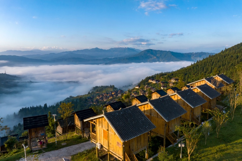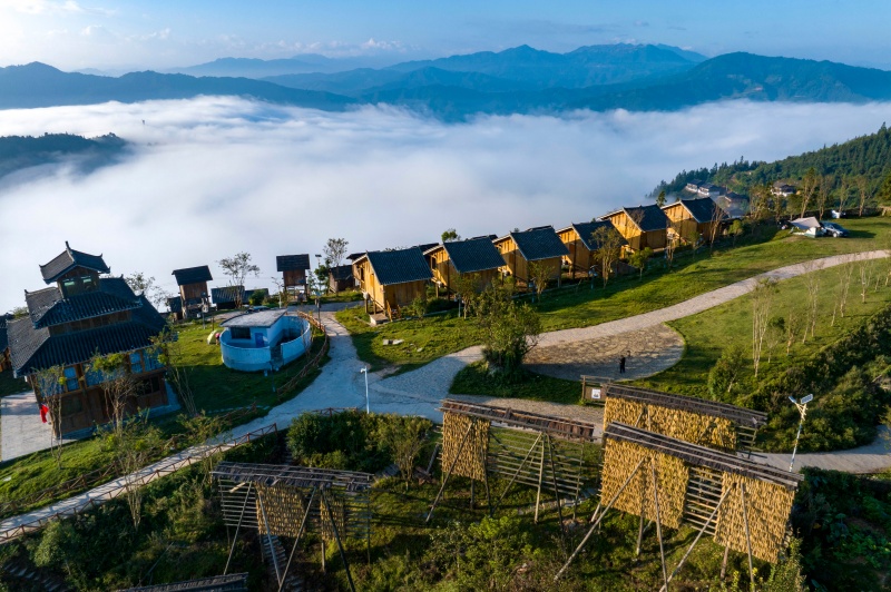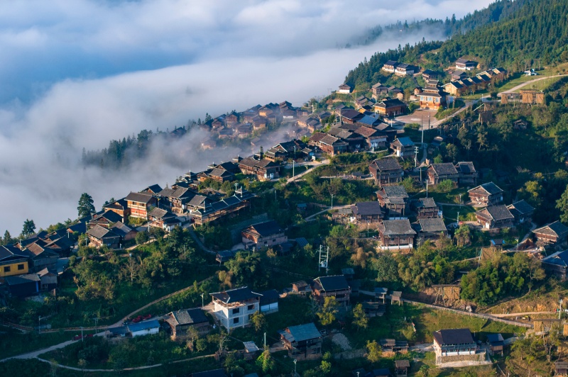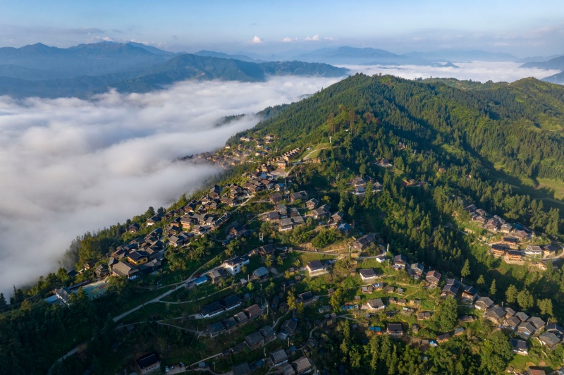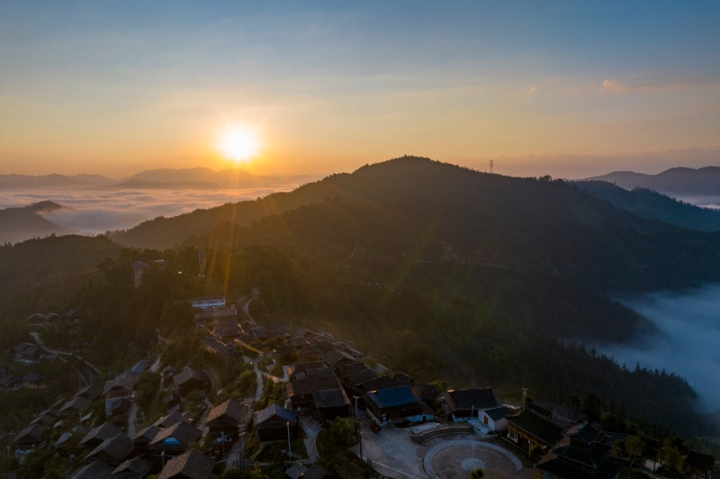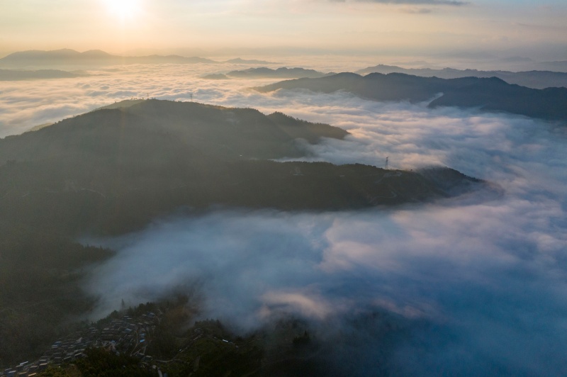 金秋时节,从江县丙妹镇大歹苗寨出现云海景观,苗寨民居、禾晾、田园、山林、公路相互映衬,宛若仙境,吸引众多游客前来观赏。