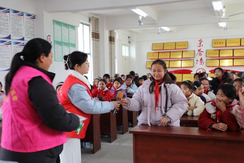 平安法治办、妇联、民政、关工委等部门也立足职能定位,从交通安全、冬季用火用电安全、未成年人权益保护等关键领域入手,通过案例警示、常识普及等方式,引导未成年儿童树立“安全第一”的理念,提高风险识别与自我保护能力,实现了“心理健康+安全教育”的全方位赋能。活动中设置的“宣传-提问-解答”互动环节,通过发放文具小礼品的形式,让孩子们在玩乐中收获知识、在关爱中感受温暖,有效提升了活动的参与度与感染力。