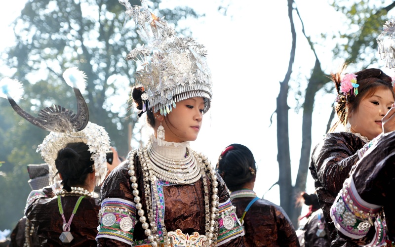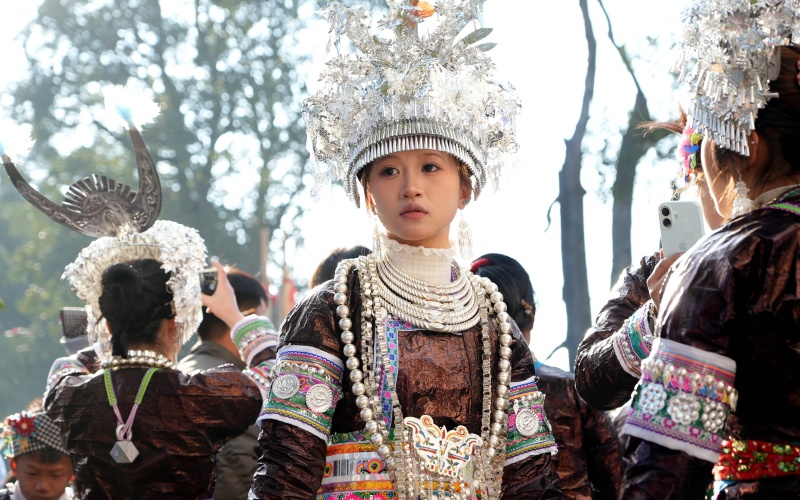晌午过后,村民们陆续聚集到芦笙场,男女老少皆身着绚丽的民族盛装,步履款款,银彩生姿,每个人的脸上都洋溢着节日的欢愉。