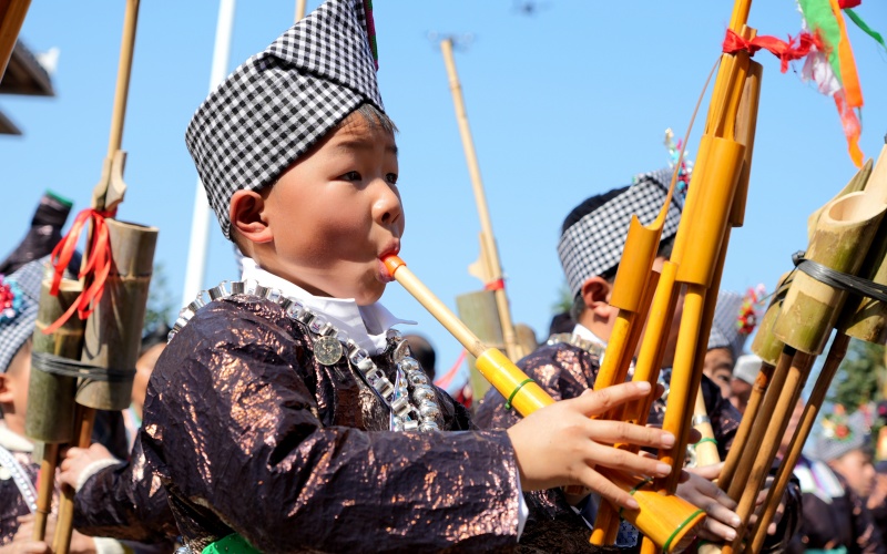 芦笙场上,从稚子孩童到白发长者,皆能执笙吹奏。随着传承千年的旋律响起,苗族姑娘手持鲜花,跟着芦笙翩迁起舞,身上的银饰伴着轻盈的步伐叮当作响。