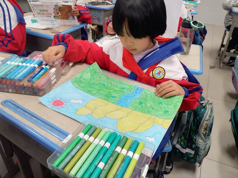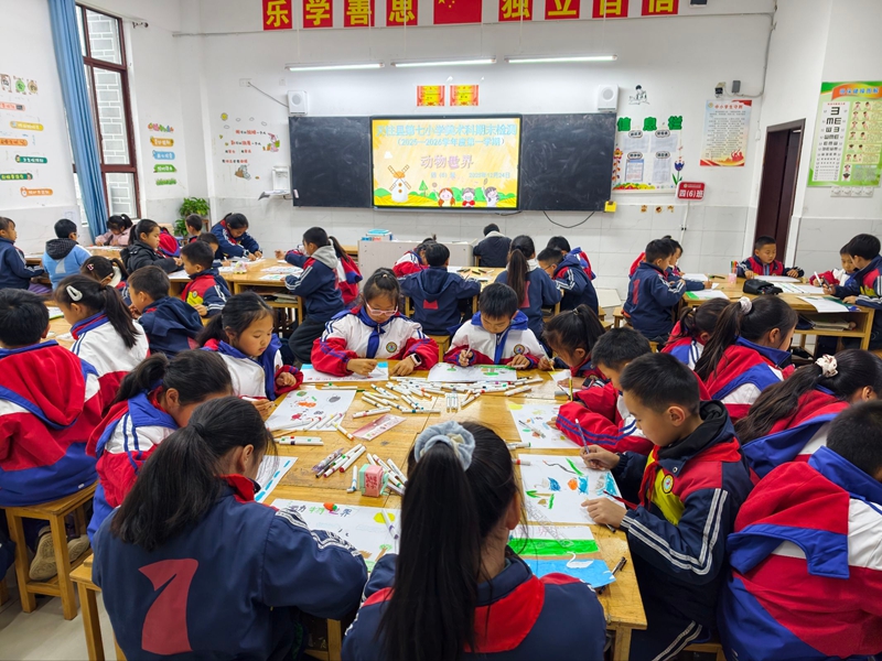美术测评教室里,同学们充分发挥自己的想象力和创造力,用手中的画笔和工具,描绘出一幅幅绚丽多彩的画卷。绘画作品中,有色彩斑斓的风景画、生动有趣的人物画、充满幻想的卡通画,每一幅作品都展现了孩子们独特的视角和丰富的内心世界。一年级:《美丽的花草》,二年级:《高山流水》,三年级:《美丽家乡》,四年级:《动物世界》,五年级:《自然景观》,六年级:《多彩田园风光》。