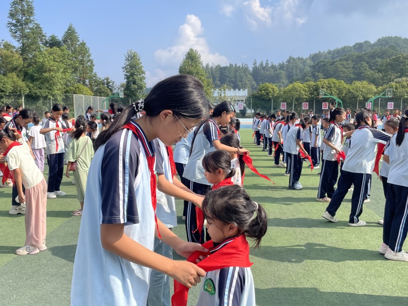 仪式在庄严的《出旗曲》中拉开序幕,队员们肃立敬礼,齐声高唱队歌,展现新时代少年昂扬向上的精神风貌。老队员为新队员佩戴红领巾,传递红色信念;新队员面向队旗庄严宣誓,立志“为共产主义事业而奋斗”。石辉校长在寄语中勉励大家践行“三爱”——爱中国共产党、爱祖国、爱人民,做到“两个好好”——好好学习、好好锻炼,听党话、跟党走,争当有理想、敢担当的新时代好少年。