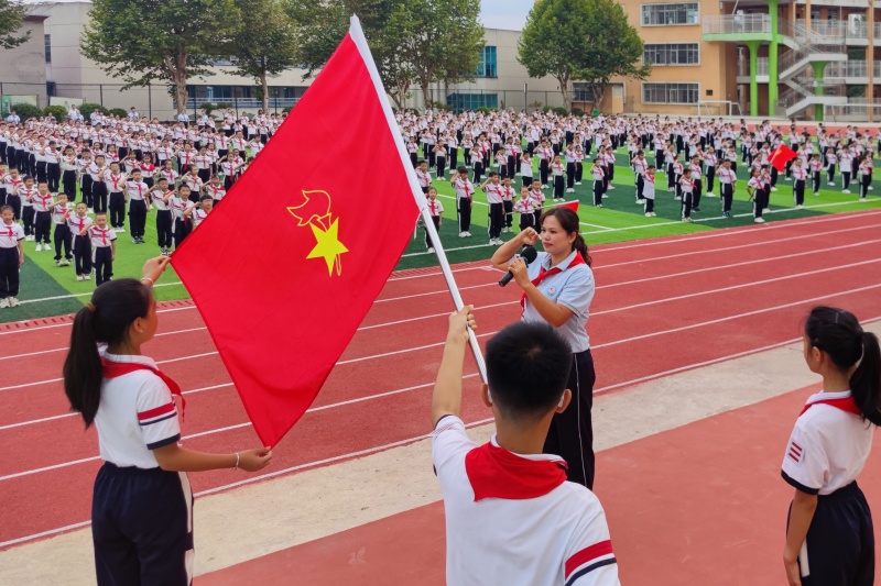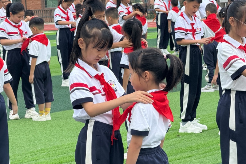 入队仪式严格遵循少先队礼仪规范,通过七个环节完整呈现。仪式开始前,少先队员代表为与会领导嘉宾佩戴上鲜艳的红领巾,以庄严队礼表达崇高敬意。在激昂的《中国少年先锋队队歌》声中,旗手高擎队旗庄严入场,全体师生肃立行礼,铿锵歌声回荡校园。仪式核心环节,辅导员蔡祥艳郑重宣读318名新队员名单,老队员为新队员佩戴上期盼已久的红领巾,完成红色基因的庄严传递。